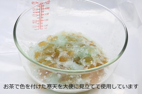 ※写真で使用している大便の代わりとなるゼリーは、お茶で色を付けた寒天です。